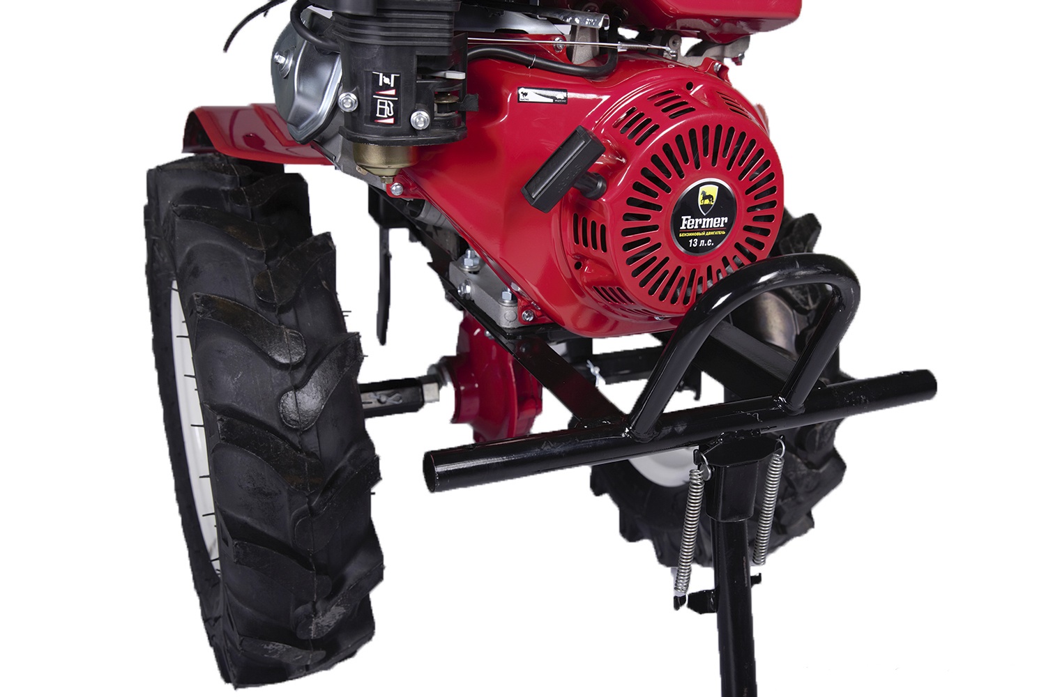 - Большие резиновые колёса — повышают проходимость и обеспечивают удобство в работе.