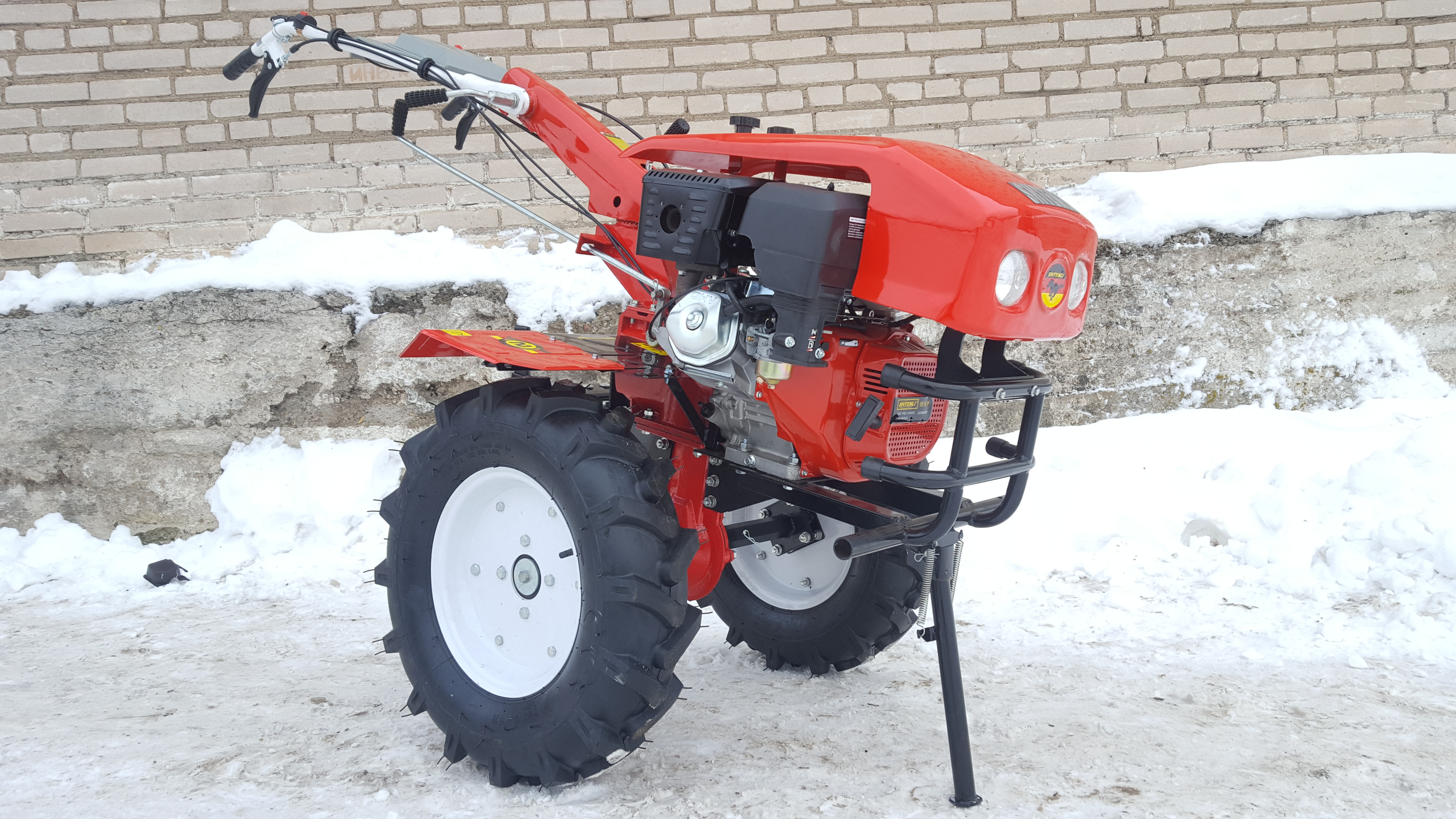 Максимальная комплектация для данной серии агрегатов. «Из коробки» Вы сразу получаете огромные колёса, самый мощный двигатель, культивирующие фрезы, универсальную сцепку, фару для работ в вечернее время и, как приятное дополнение, удобный бардачок на ручке. Так же в комплекте идет специальная защита на колеса, которая защищает фермера от земли и грязи.