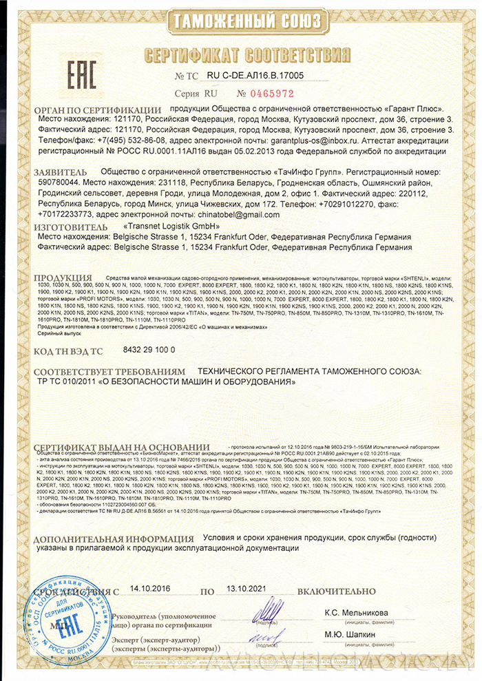 Описание мотоблока Shtenli 1030:
