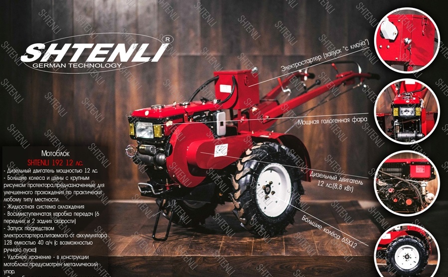Мотоблок Shtenli G-192 — это профессиональный многофункциональный агрегат, который поражает своими габаритами, весом и мощностью дизельного двигателя. Можно сказать, что Вы приобретаете трехколесный минитрактор. Обладая весом в 320 килограммов — эта техника способна выполнять работы повышенной сложности, а дизельный двигатель на 12 лошадиных сил позволяет с легкостью управлять этим процессом.